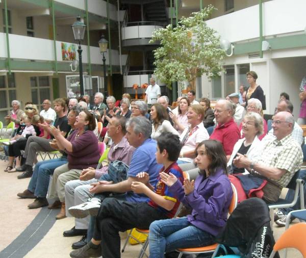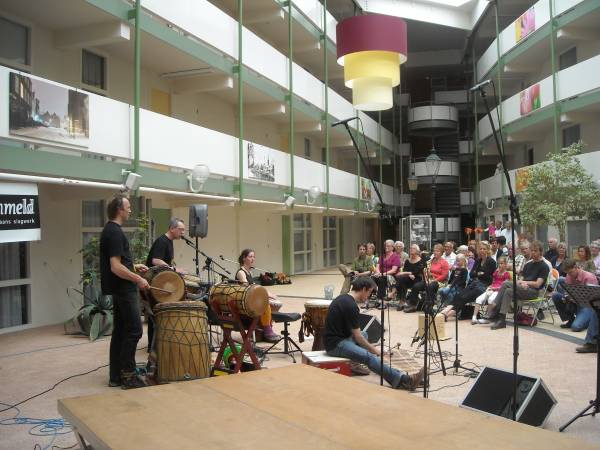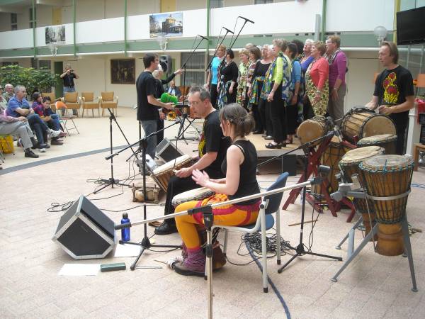 Waren er bij het begin van het optreden vooral liefhebbers van de o.a. Afrikaanse muziek als toeschouwer aanwezig, de ritmische geluiden deden vele deuren op de galerijen opengaan. Vandaag geen middagdutje voor de bewoners, maar een donderen, geslaagd concert!