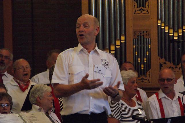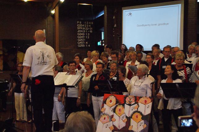 Op een groot scherm werd het refrein van de liederen geprojecteerd zodat het massaal toegestroomde publiek op aanwijzing van de dirigent/zwaaibaas Ad Pronk mee kon zingen.