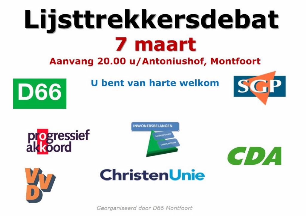 Weet u al op wie u gaat stemmen 19 maart? Of zoekt u nog meer informatie over de verschillende partijen? Kom dan aanstaande vrijdag 7 maart naar het lijsttrekkersdebat in het Antoniushof. Onder leiding van Mariëtte Pennarts, gedeputeerde bij de provincie Utrecht en oud-gemeenteraadslid, debatteren alle lijsttrekkers over verschillende onderwerpen. Iedereen is van harte welkom. Om 20.30 uur start het debat, de inloop is om 20.00 uur.