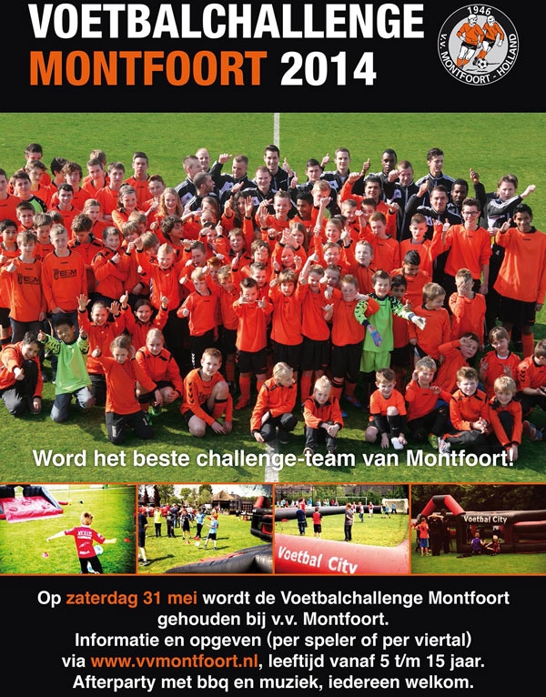 Geplaatst op:19-05-2014 Bijgewerkt op:19-05-2014 12:40 V V Montfoort organiseert Challenge DayBron: Dick ten HoonteOp zaterdag 31 mei sluit v.v. Montfoort normaal gesproken het seizoen af met een Familiedag. Dit seizoen is gekozen voor een iets andere opzet. De Familiedag heeft plaats gemaakt voor een zg. Challenge Day.