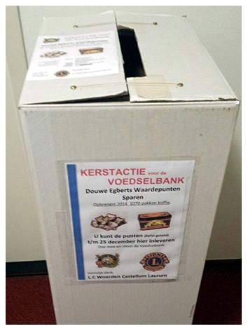 Geplaatst op:01-12-2015 Bijgewerkt op:01-12-2015 12:34 Kerstactie koffie Lionsclubs weer van startBron: RTL WoerdenOok dit jaar gaan de Lionsclubs in Nederland weer Douwe Egberts koffiepunten inzamelen voor het goede doel. Deze punten worden bij Douwe Egberts verzilverd tegen pakken koffie voor de voedselbanken in Nederland. De kerstactie van vorig jaar leverde op deze manier 120.000 pakken koffie op.