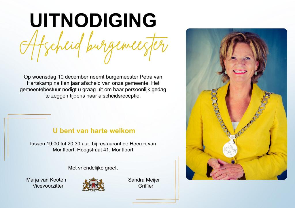 Meer berichten in deze categorie:Op 10 december neemt burgemeester Van Hartskamp afscheid (01-12-2025) Visie Stadspark vastgesteld met aanpassingen (01-12-2025) Straten bladvrij maken (28-11-2025) Werkcafe Montfoort geopend door burgemeester (28-11-2025) Heropening opvanglocatie voor Oekraiense ontheemden in Linschoten (28-11-2025) Aukje Treep - Van Hoeckel waarnemend burgemeester gemeente Montfoort (21-11-2025) Regiotaxi Utrecht trekt gezamenlijk lessen voor toekomstig doelgroepenvervoer voor de regio; (21-11-2025) Nederland valt uit (21-11-2025) Gemeenten roepen op tot gelijkwaardige bescherming rond windenergie (21-11-2025) 1 milieuorganisatie voor de hele provincie (21-11-2025) Raadscommissievergaderingen 1 en 2 december 2025 (21-11-2025) Isolatieactie voor woningeigenaren met Winst uit je Woning (14-11-2025) Omgevingsdienst Utrecht: één milieuorganisatie voor de hele provincie (12-11-2025) Uitkomst evaluatie hondenlosloopgebied stadspark (07-11-2025) Strooiseizoen gestart (07-11-2025) Raadpleging door provincie Utrecht voor windenergie in Linschoten/Oudewater (07-11-2025) OV-chipkaart opladen met de Groene Hart Pas (07-11-2025) Raadsvergadering 17 november 2025 (06-11-2025) Ondanks woningtekort loopt het nog niet storm bij huizenfabriek (04-11-2025) Gemeente geinformeerd over faillissement Winst uit je woning (04-11-2025) De bladkorven zijn weer terug (31-10-2025) Voorlopige uitslag Tweede Kamer verkiezing in Montfoort (31-10-2025) Volgende stap voor project Laan van Overvliet (28-10-2025) Sluitende begroting voor gemeente Montfoort (28-10-2025) Rijrichting Hoogstraat binnenstad Montfoort wijzigt (20-10-2025)